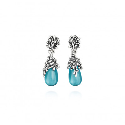 Gli orecchini Goccia Mare sono un omaggio alla delicatezza del mondo marino. La lavorazione con fusione a cera persa in argento riproduce con eleganza la forma di un anemone, che avvolge un cristallo azzurro dalla forma a goccia.