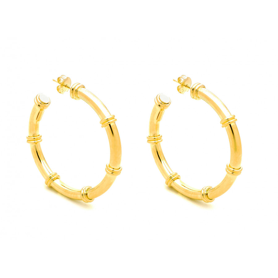 Questi orecchini nascono dalla volontà di Giovanni Raspini di creare un gioiello in argento dorato classico e contemporaneo. La lavorazione a canna vuota regala linearità e tanta luce ad incorniciare il volto. Coppie di anelli torniti e saldati sul gioiello formano un elegante effetto geometrico.