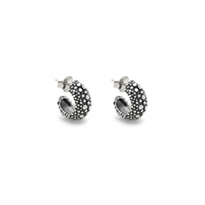 Raffinati e luminosi, gli orecchini Petit Perlage uniscono sapienza artigianale e design contemporaneo. Realizzati con la tecnica della fusione a cera persa, presentano una superficie in argento brunito, animata da un pavé di microsfere finemente diamantate.