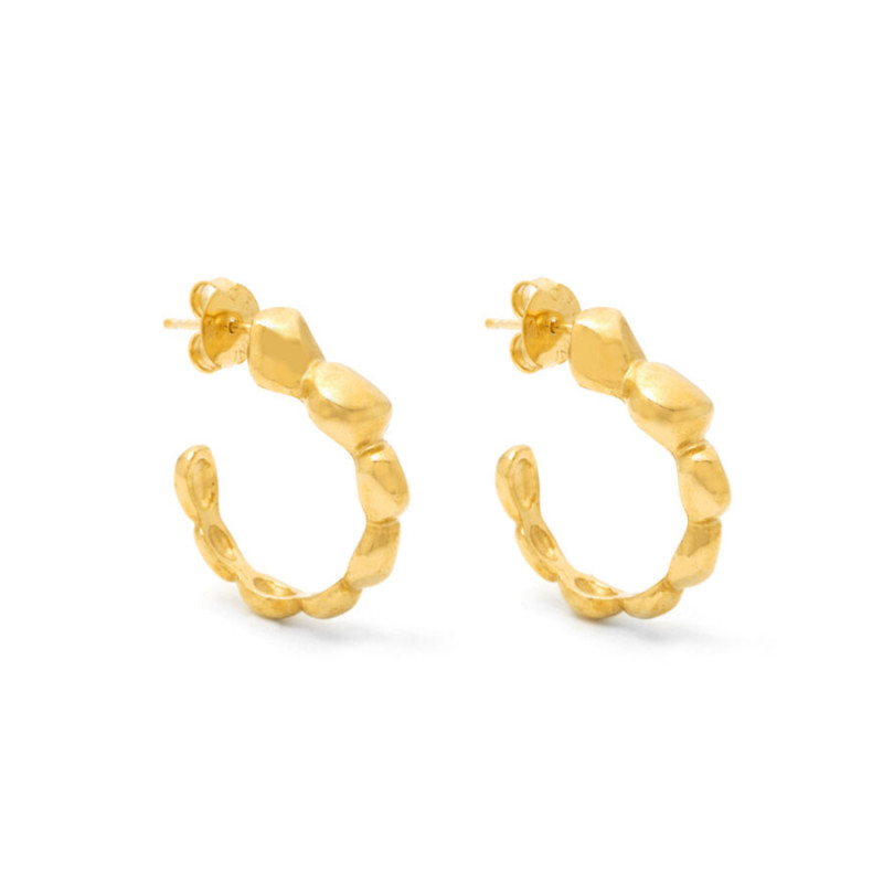 Questi orecchini a cerchio, grazie ad un design quasi organico, esprimono il desiderio di una ricerca sempre nuova di volumi e luminosità. Eleganti e contemporanei, essi sono realizzati in argento dorato fuso a cera persa.