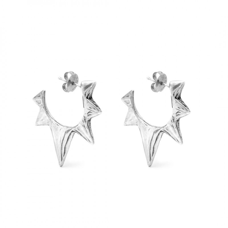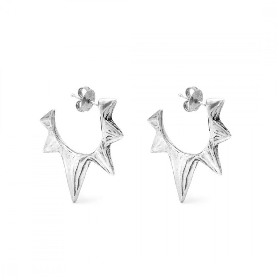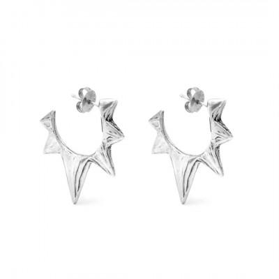 Divertenti e modernissimi, gli orecchini Rock Star in argento propongono una superficie spatolata a mano e bordi in forma di cuspidi. Sono realizzati interamente in home con l'antica tecnica della fusione a cera persa.