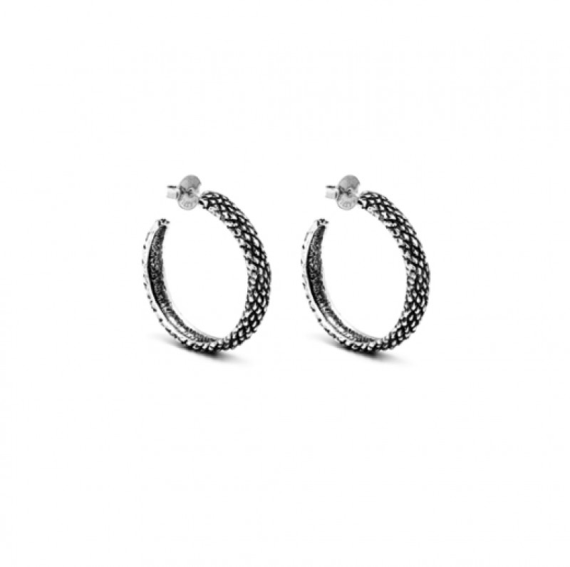 Collezione Serpente - Gli orecchini Cerchio Serpente regalano texture di argento brunito e scaglie lucenti di serpente. Il tema stilistico figurativo viene interpretato in termini contemporanei, realizzando un gioiello luminoso e dal fascino astratto.