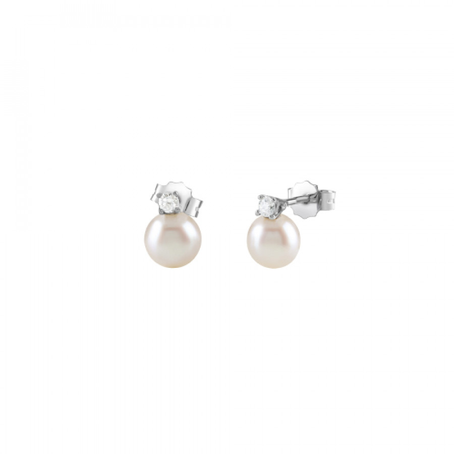 Orecchini Bliss Paradise in oro bianco 18 KT, diamanti 0.1 CT e perle bianche 8 mm