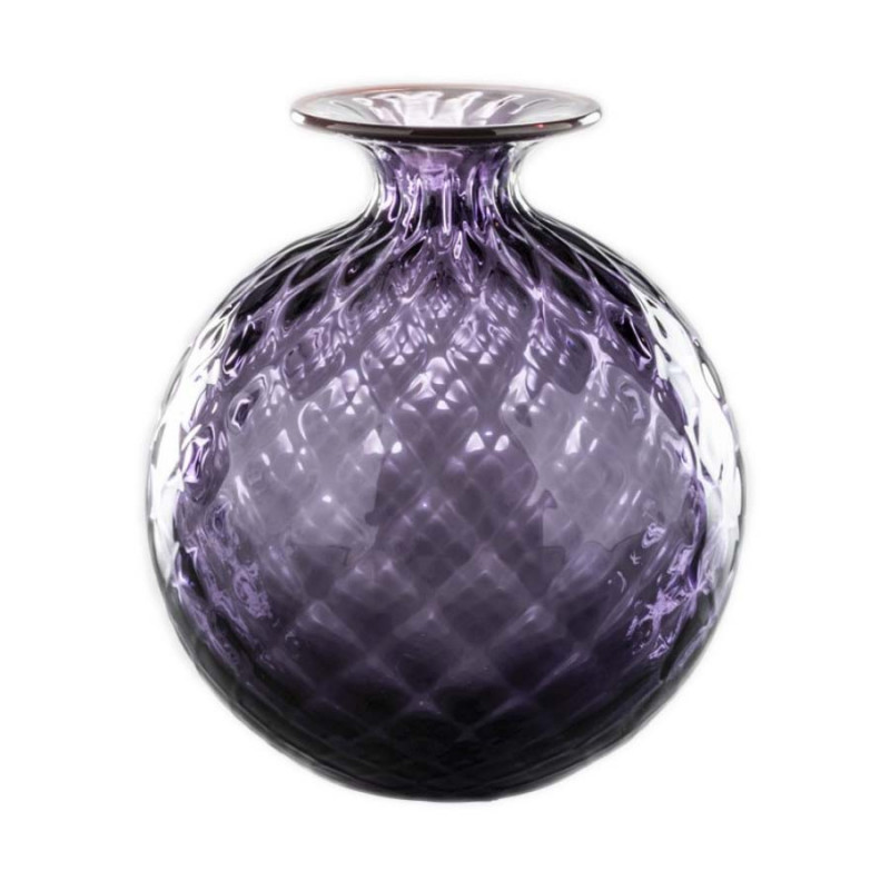 Vaso in vetro soffiato lavorato a mano con la tradizionale tecnica della lavorazione a Balloton, decorato con filo riportato a caldo sulla parte superiore dell’oggetto.