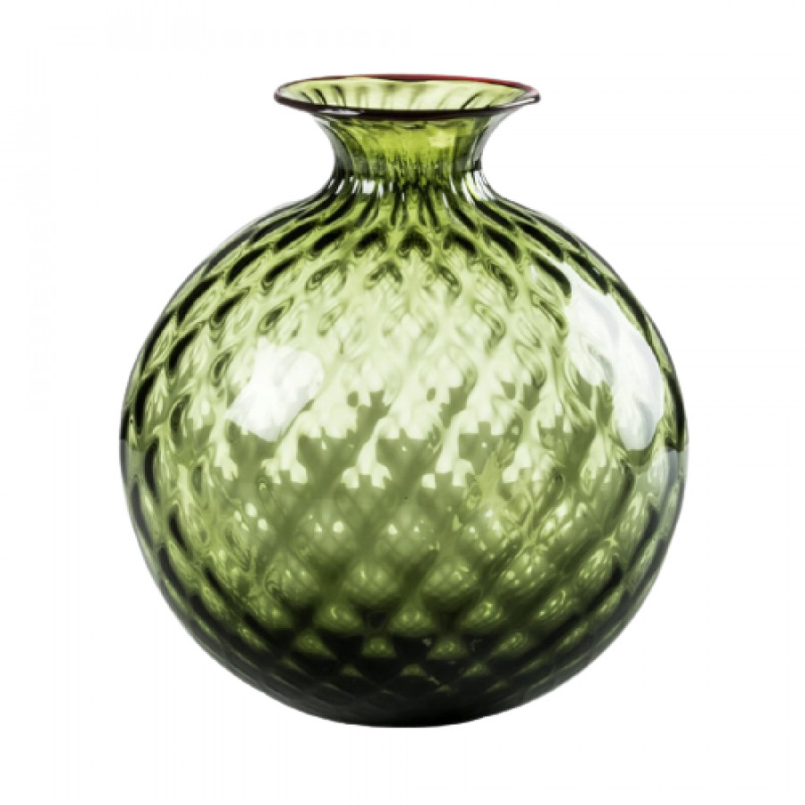 Vaso in vetro soffiato lavorato a mano con la tradizionale tecnica della lavorazione a Balloton, decorato con filo riportato a caldo sulla parte superiore dell’oggetto.