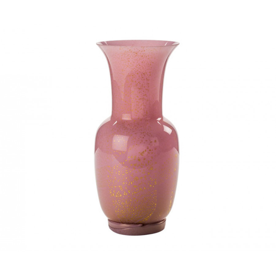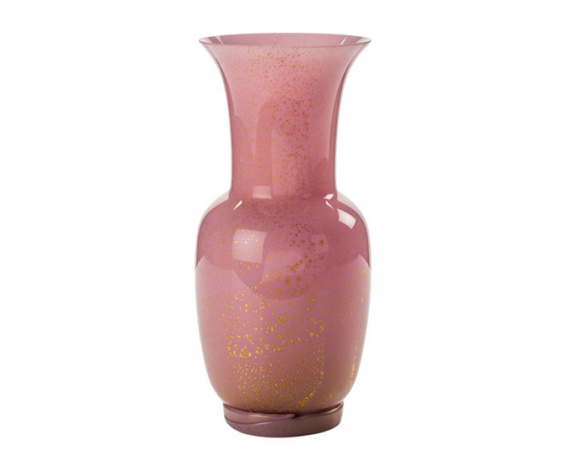 Qui il vetro opalino è color rosa opaco decorato da piccoli dettagli in foglia oro.