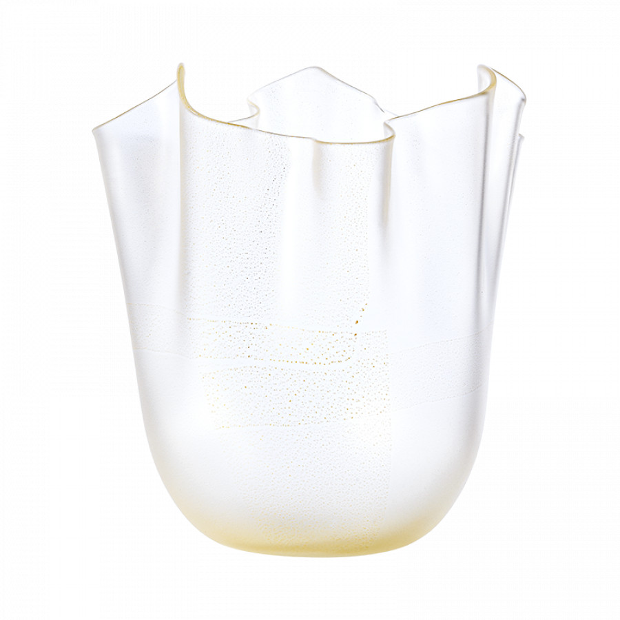 Vaso Venini Fazzoletto soffiato opalino, mano Volante. Colore Cristallo Foglia Oro Sabbiato.