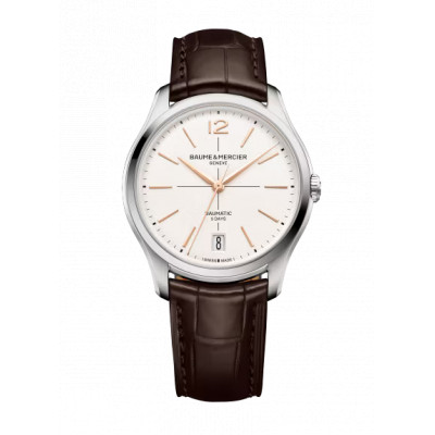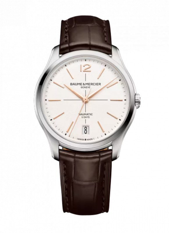 Il Clifton 10773 ha una cassa rotonda in acciaio inossidabile satinato e si aggiunge alla collezione in un formato di 39 mm. La cassa presenta una corona in acciaio e un fondello aperto in zaffiro. Il sottile quadrante bianco sporco con finitura granulata, orlato da una minuteria e da un mirino neri, mette in evidenza il numero arabo a ore 12, gli indici dorati e sfaccettati rivettati a forma di trapezio e le lancette a forma di alfa. È dotato di un movimento Baumatic a carica automatica (BM13-1975A) con riserva di carica di 5 giorni e impermeabilità fino a 5 ATM. Il cinturino intercambiabile in alligatore marrone è dotato di un affidabile sistema di sostituzione senza attrezzi.