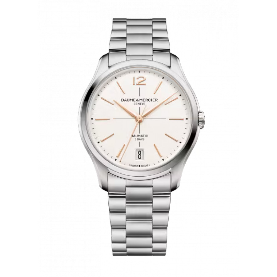 Il Clifton 10793 ha una cassa rotonda in acciaio inossidabile satinato e si aggiunge alla collezione in un formato di 39 mm. La cassa presenta una corona in acciaio e un fondello aperto in zaffiro. Il sottile quadrante bianco sporco con finitura granulata, orlato da una minuteria e da un mirino neri, mette in evidenza il numero arabo a ore 12, gli indici dorati rivettati a forma di trapezio e le lancette a forma di alfa. È dotato di un movimento Baumatic a carica automatica (BM13-1975A) con riserva di carica di 5 giorni e impermeabilità fino a 5 ATM. Il bracciale integrato intercambiabile in acciaio inossidabile a 3 file è dotato di un sistema affidabile per la sostituzione senza attrezzi.