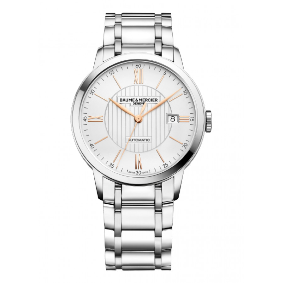 Questo orologio in acciaio e oro, con movimento automatico visibile dietro al fondello in vetro zaffiro trasparente, rappresenta l’epitome della raffinatezza maschile. È un orologio rotondo da 42 mm con cassa in acciaio lucido e bracciale abbinato. Presenta un quadrante argentato con un’elegante finitura opalina ed è impreziosito da un decoro a linee guilloché, lancette dorate delle ore, dei minuti e dei secondi, oltre a cifre romane dorate per contrassegnare il tempo. È presente un datario a finestrella a ore 3