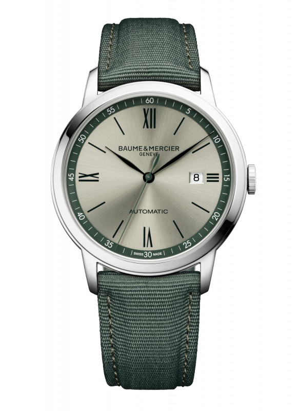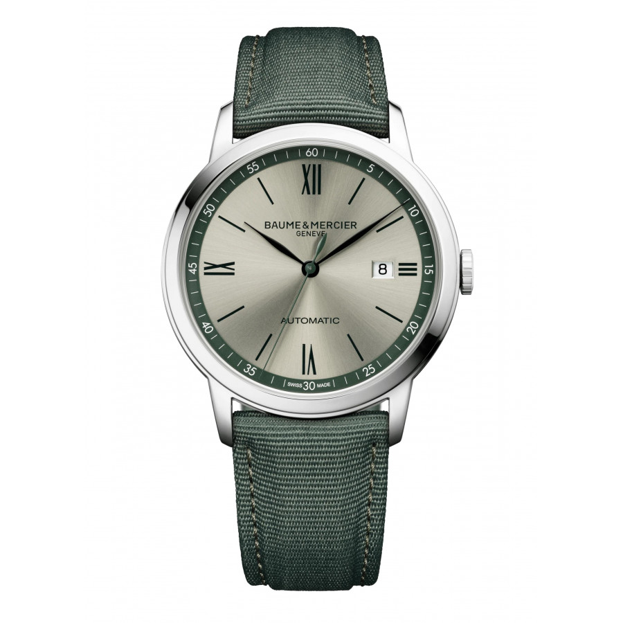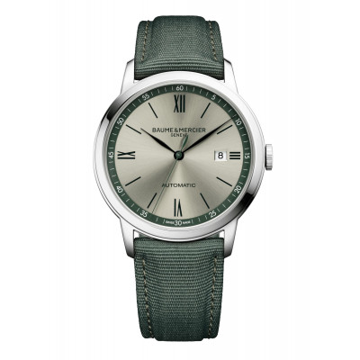 Il Baume & Mercier Classima 10696 offre un look casual grazie al suo quadrante color argento caldo con finitura satinata soleil e flangia verde. È accompagnato da un cinturino intercambiabile in tela verde dallo stile ispirato alla natura, ideale per tutti gli amanti del green.
