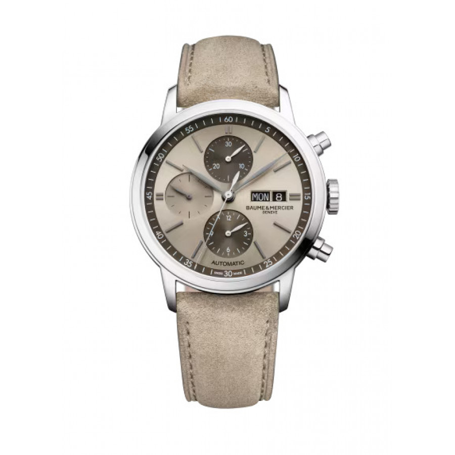 Il modello Classima 10782 vanta un design sofisticato caratterizzato da un quadrante color sabbia con finitura soleil, dettagli color antracite e contatori ausiliari azzurrati. Racchiuso in una cassa da 42 mm in acciaio inossidabile con finitura lucida, questo Classima Cronografo presenta due datari a finestrella per giorno e data, movimento a carica automatica, riserva di carica di 48 ore e impermeabilità fino a 5 ATM. È corredato da un cinturino intercambiabile in pelle di vitello scamosciata color sabbia con fibbia pieghevole in acciaio inossidabile.