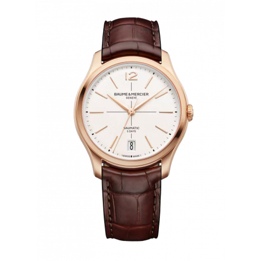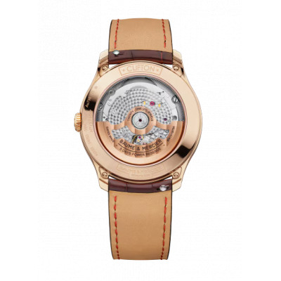 Il Clifton 10802 ha una cassa rotonda in oro rosa (750/1000) lucido-satinato e si aggiunge alla collezione in un formato di 39 mm. La cassa presenta una corona in oro rosa (750/1000) e un fondello aperto in zaffiro. Il sottile quadrante bianco sporco con finitura granulata, orlato da una minuteria e da un mirino neri, mette in evidenza il numero arabo a ore 12, gli indici dorati rivettati a forma di trapezio e le lancette a forma di alfa. È dotato di un movimento Baumatic a carica automatica (BM13-1975A) con riserva di carica di 5 giorni e impermeabilità fino a 5 ATM. Il cinturino intercambiabile in alligatore marrone è dotato di un affidabile sistema di sostituzione senza attrezzi.