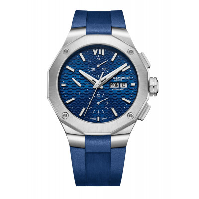 Dotato di un movimento automatico Valjoux, questo Baume & Mercier Riviera è ornato da un quadrante blu satinato con decoro soleil e cinturino in caucciù blu coordinato. Un segnatempo dal carattere deciso, che si inserisce perfettamente nella tradizione cronografica della Maison.