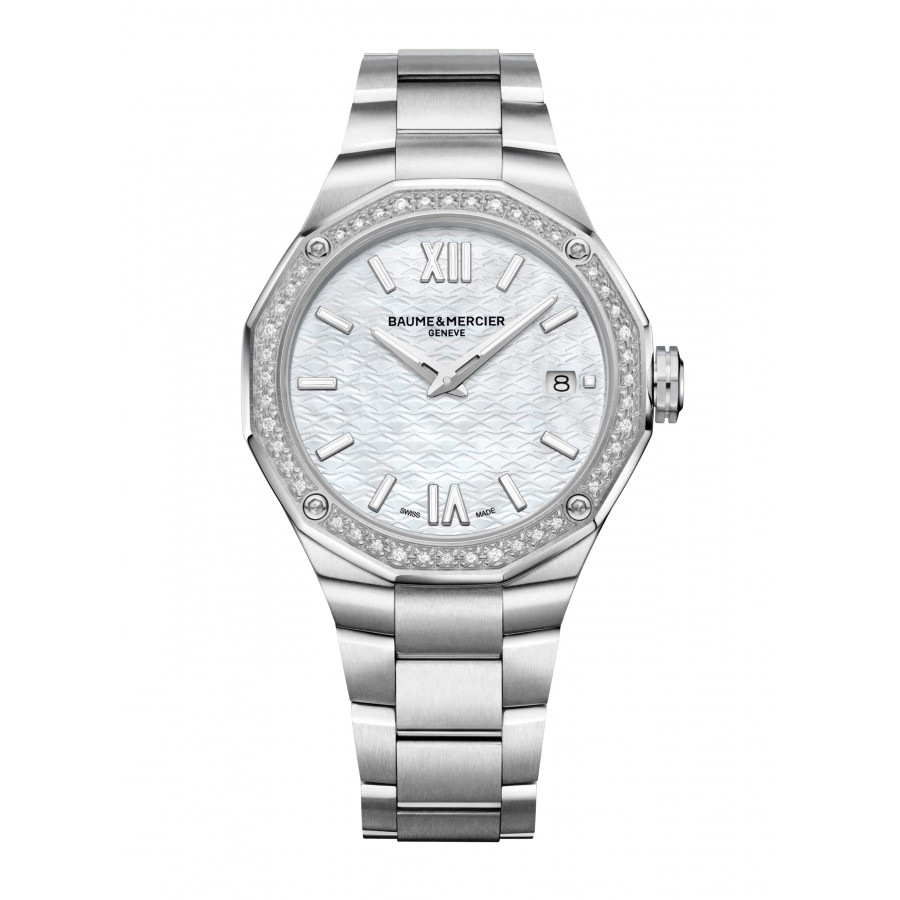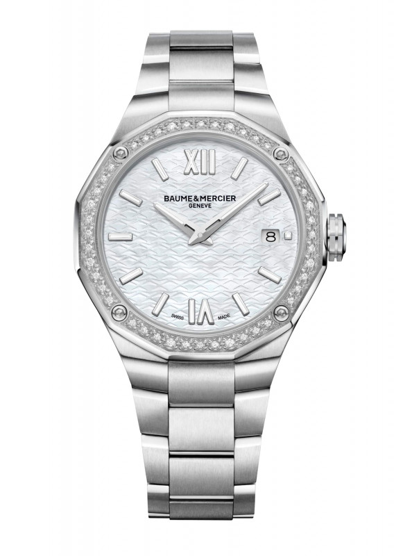 Il Baume & Mercier Riviera 10662 luccica più di qualsiasi altro segnatempo. Dotato di lunetta in acciaio inossidabile lucida e satinata con finitura soleil impreziosita da 44 diamanti, questo segnatempo è contraddistinto da una decorazione a onde in madreperla bianca e trasparenti. Con l’aggiunta del suo bracciale in metallo, incarna la raffinatezza.
