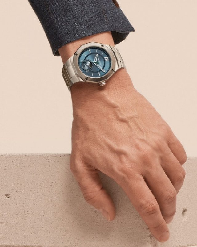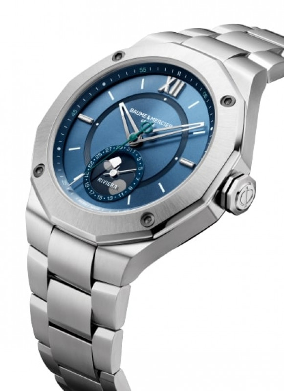 A prima vista, evoca la luna nelle sue sfumature e nei suoi misteri. Con un cinturino in caucciù grigio con decorazione in tela, il nuovo Riviera Baumatic "Moonphase" gioca sulla sobrietà. Il quadrante color sabbia ricorda i grandi deserti argentei che formano i paesaggi poetici che conosciamo della Luna. Laccato e satinato, il suo bellissimo e complesso quadrante è messo in risalto da un rehaut grigio scuro il cui colore riprende sottilmente il piccolo quadrante ausiliario situato a ore 6 che indica la data e le fasi lunari. Con un design efficiente e raffinato, il nuovo Riviera Baumatic "Moonphase" mostra la sua personalità in una cassa d'acciaio di 43 mm di diametro che riprende i codici caratteristici della famiglia Riviera: lunetta dodecagonale d'acciaio fissata da 4 viti d'acciaio (trattamento ADLC nero microbigliato), numero romano a ore 12, indici rivettati a ore 3 e a ore 9.