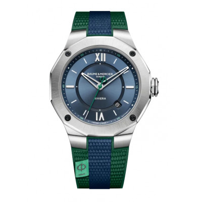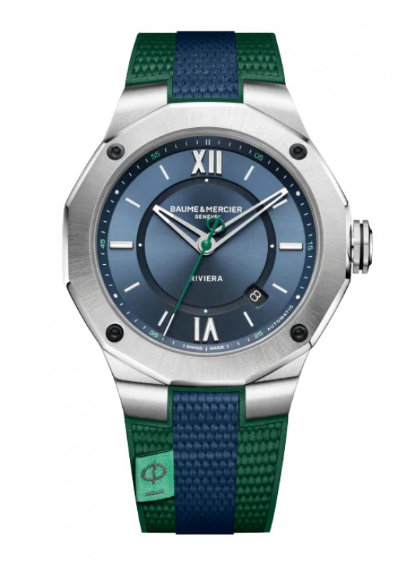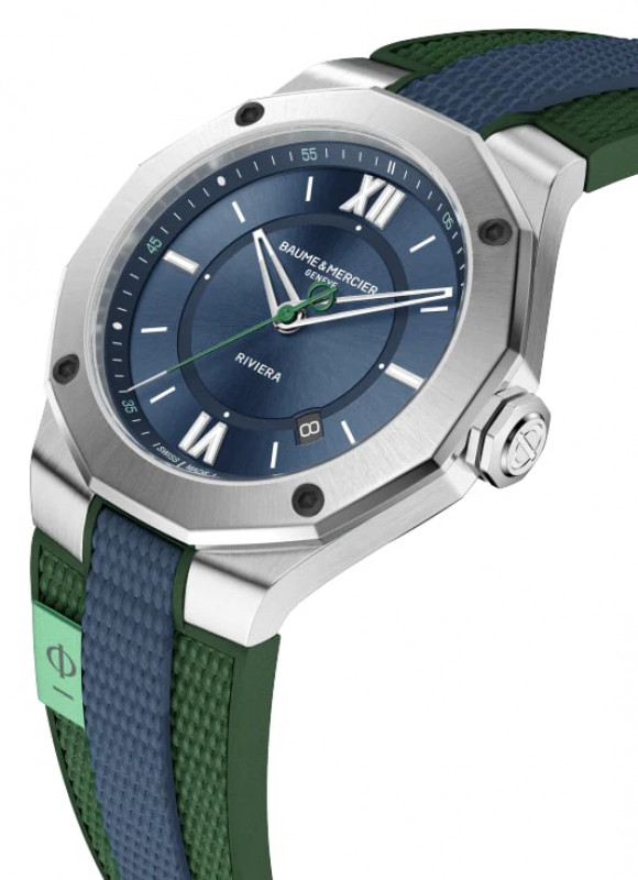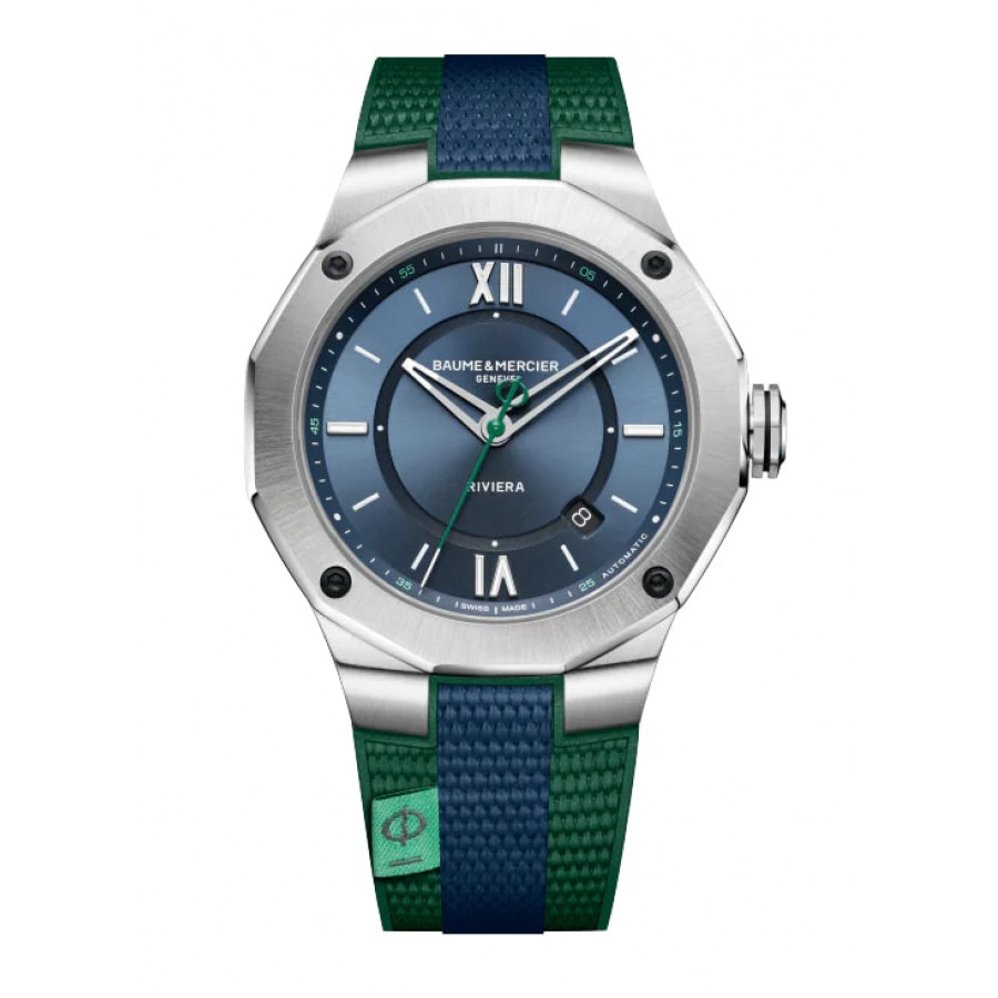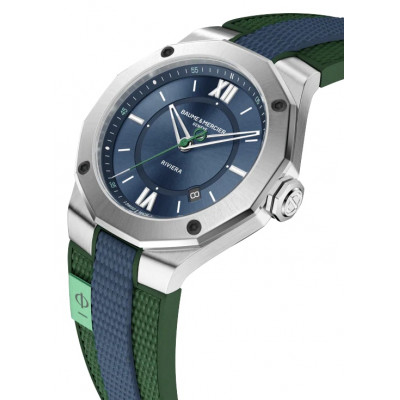 Sportivo e casual, questo Riviera è un segnatempo in grado di soddisfare molte personalità diverse. Il movimento automatico "Swiss Made" combinato al quadrante blu, alle lancette traforate e alle viti sabbiate conferisce audacia a questo segnatempo montato su un caucciù multistrato blu e verde.