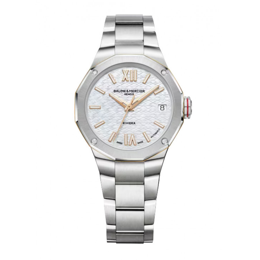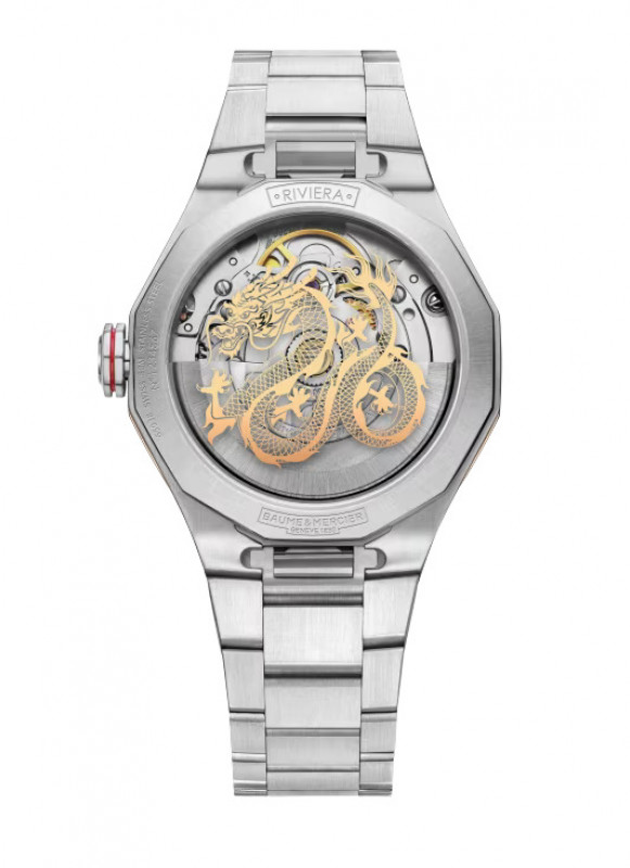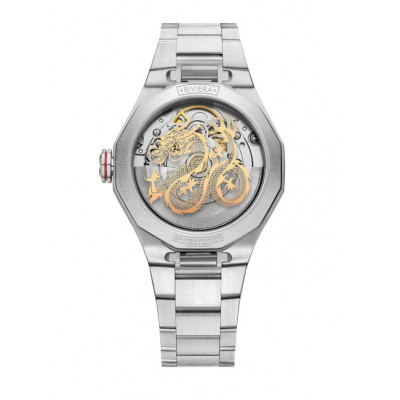 Il Riviera Chinese New Year - Dragon Edition ha una cassa in acciaio di 33 mm con finiture lucide e satinate. Il quadrante è impreziosito da madreperla bianca coltivata e da attributi in oro, dalla lunetta con 4 diamanti incastonati e dal bracciale in metallo, per un orologio decisamente luminoso. Sul fondello è presente anche la firma del drago in oro metallizzato.