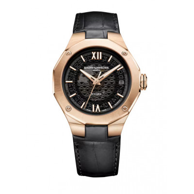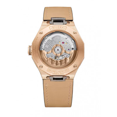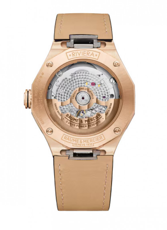 Il modello Riviera 10787 presenta una cassa dodecagonale in oro rosa (750/1000) lucido-satinato abbinata a un quadrante in vetro zaffiro nero trasparente. Le proporzioni di questo elegante segnatempo mostrano l’equilibrio perfetto di cui Baume & Mercier è in perenne ricerca: 39 mm di diametro per 9,6 mm di spessore. La raffinatezza della lunetta in oro rosa (750/1000) lucido e satinato soleil – fissata con quattro viti in oro rosa (750/1000) – si estende alla corona ottagonale libera, anch’essa realizzata in oro rosa (750/1000) e ornata con l’emblema del brand, il logo Phi in rilievo con una linea nera.