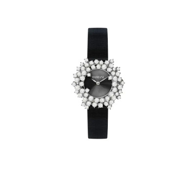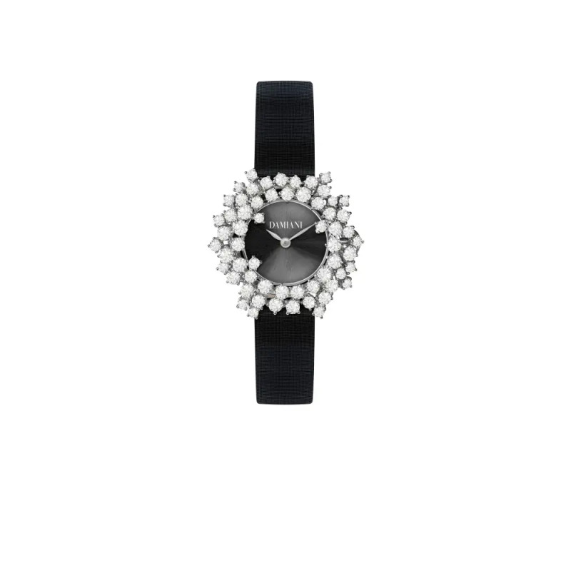 Orologio Damiani in oro bianco e di diamanti, cinturino nero collezione Mimosa.