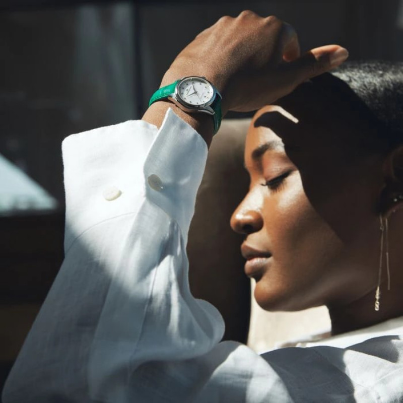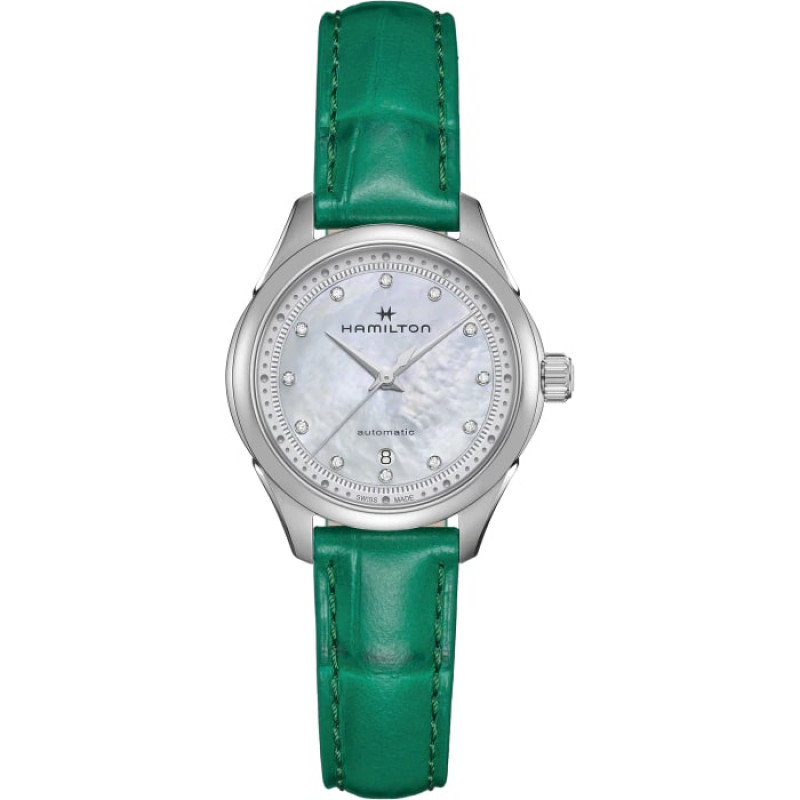 L'elegante cinturino in pelle verde con finitura in alligatore ed il quadrante in madreperla con indici in diamanti, sono gli elementi distintivi di questo Hamilton Jazzmaster Lady Auto. Il movimento automatico con 44 ore di riserva di carica, racchiuso nella cassa da 30 mm, è sinonimo di precisione ed affidabilità.