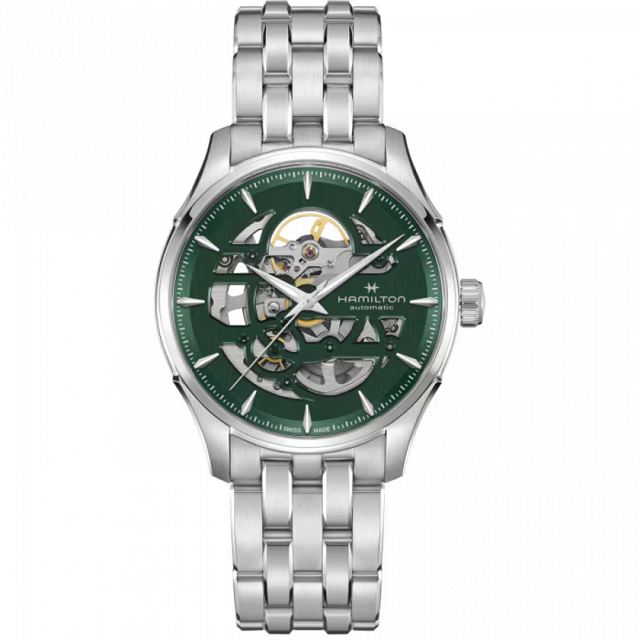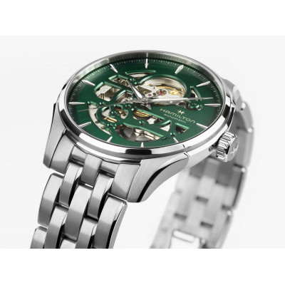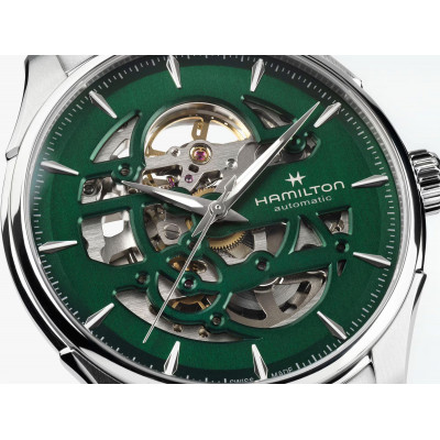 Connubio perfetto di tradizione e innovazione, l'Hamilton Jazzmaster Skeleton 40 mm permette di ammirare il movimento automatico svizzero in azione. Il quadrante scheletrato, con la sua straordinaria tonalità verde impero, rivela il movimento automatico H-10-S, con 25 rubini e un’impressionante riserva di carica di 80 ore. Questo iconico segnatempo è abbinato a un elegante bracciale in acciaio, che incarna dinamismo moderno e fascino intramontabile.