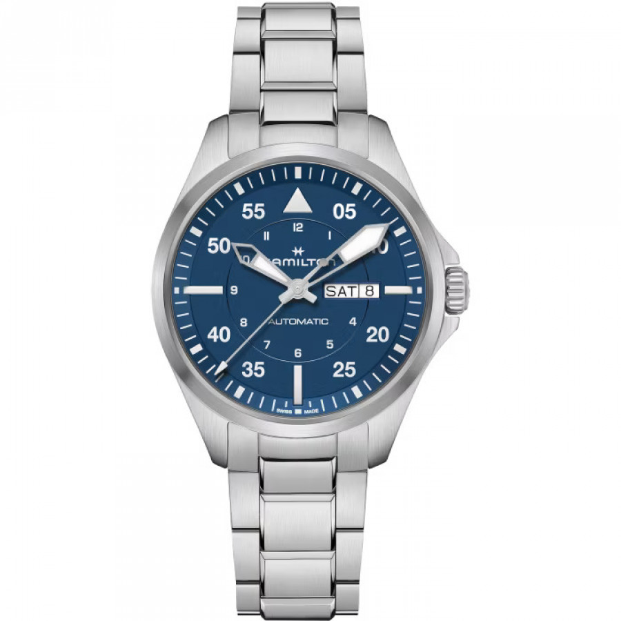 Realizzato pensando agli appassionati di aviazione, il Khaki Aviation Pilot Day Date richiama immediatamente lo spirito di esplorazione e di avventura del Khaki. Animato dal movimento automatico H-30 con riserva di carica di 80 ore e spirale in Nivachron™, questo modello presenta sul quadrante un datario e dei numeri sovradimensionati, per una maggiore leggibilità. Il Khaki Aviation Day Date 42 mm è completato da un bracciale sobrio in acciaio, abbinato a un quadrante blu scuro, per ricordare le infinite possibilità che offre il cielo.