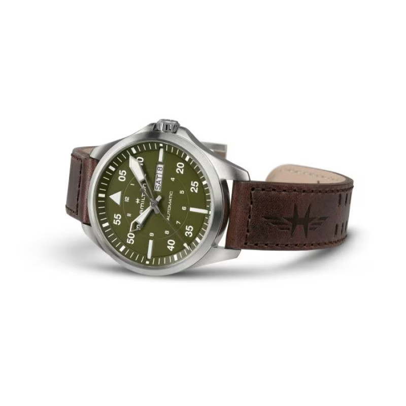 Realizzato pensando agli appassionati di aviazione, il Khaki Aviation Pilot Day Date richiama immediatamente lo spirito di esplorazione e di avventura del Khaki. Animato dal movimento automatico H-30 con riserva di carica di 80 ore e spirale in Nivachron™, questo modello presenta sul quadrante un datario e dei numeri sovradimensionati, per una maggiore leggibilità. Il Khaki Aviation Day Date 42mm abbina un orologio cinturino in pelle marrone e un quadrante verde oliva, rendendo omaggio alle radici avventurose del Khaki, votato alla vita all’aperto.