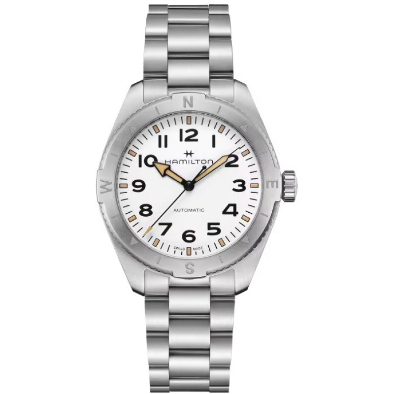 Preparati per le avventure all’aria aperta con il Khaki Field Expedition, un orologio ideale per tutte le attività outdoor con un design a bussola. Racchiuso in una cassa in acciaio da 41 mm corredata da un bracciale coordinato a 3 maglie con fibbia déployante, è dotato di una corona a vite per proteggere il movimento. Completato da un quadrante bianco con finitura sabbiata per una leggibilità eccezionale, l'Hamilton Khaki Field Expedition è un segnatempo incredibilmente resistente.