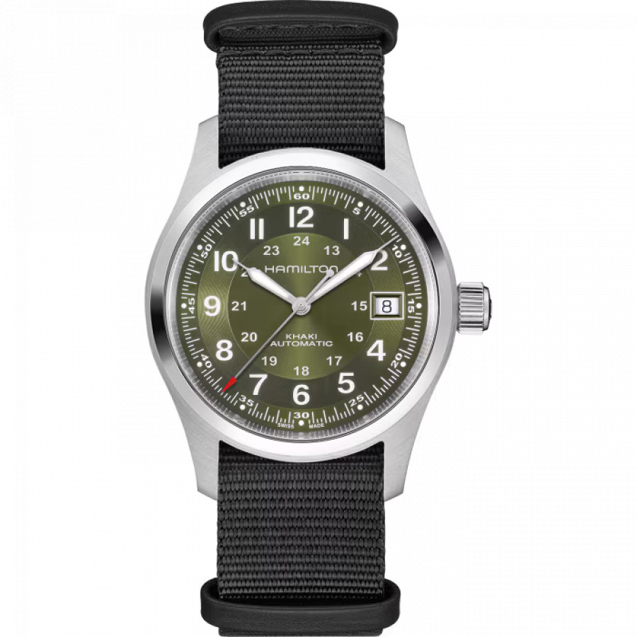 Orologio Hamilton automatico verde e nero da 38 mm appartenente alla collezione Hamilton Khaki Field