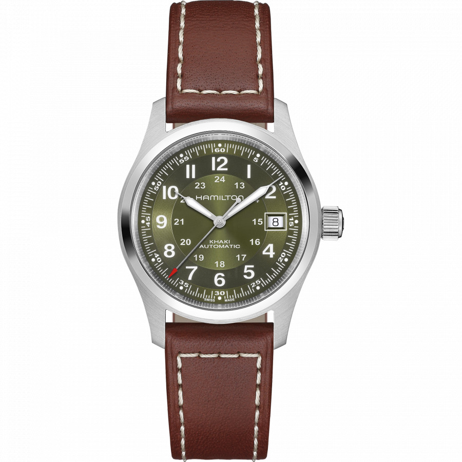 Ispirato all’originale orologio militare, l'Hamilton Khaki Field Automatic unisce tradizione militare e design contemporaneo in un modello versatile, pensato per i pionieri moderni. Combinando un quadrante verde kaki finitura soleil con un effetto a spirale sull’anello delle ore, il quadrante riflette la luce aggiungendo texture e profondità. Progettato per l’azione e l’avventura, l’esclusivo calibro automatico H-10 offre fino a 80 ore di riserva di carica, per un orologio che non ti deluderà mai. Scopri la nostra collezione Khaki Field.