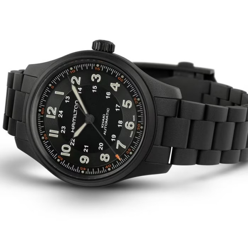 Caratterizzato da una cassa in titanio e bracciale con rivestimento in PVD nero, il Khaki Field Titanium 42 mm è un orologio altamente versatile, perfetto per essere indossato in ogni occasione. Il quadrante nero dall’ottima leggibilità ti permette di tenere i tempi di tutte le tue avventure, mentre il bracciale presenta una finitura sabbiata che aggiunge robustezza e carattere al design militare. Abbinando leggerezza e funzionalità allo stile militare, il Khaki Field Titanium è il tuo fedele alleato nella ricerca di nuove esperienze.