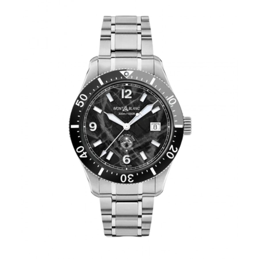 Il primo orologio da immersione sportivo di Montblanc, il Montblanc 1858 Iced Sea Automatic Date, presenta un quadrante con motivo “ghiacciaio” che dà l’impressione di guardare nelle profondità di un ghiacciaio. Questo quadrante nero con motivo “ghiacciaio” è ispirato al Mer de Glace (Mare di Ghiaccio), il ghiacciaio principale del Massiccio del Monte Bianco. La sua texture è stata ottenuta utilizzando una tecnica ancestrale quasi dimenticata chiamata gratté-boisé. Il segnatempo presenta inoltre una lunetta unidirezionale in ceramica bicolore, un fondello inciso e un bracciale conico in acciaio pregiato intercambiabile con regolazioni raffinate, per una vestibilità perfetta. Il segnatempo è conforme alla normativa ISO 6425 per gli orologi da immersione ed è impermeabile fino a 300 metri.