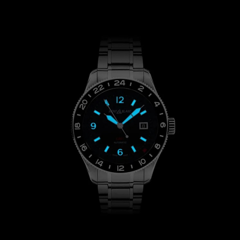 Mentre la maggior parte dei segnatempo GMT indica il secondo fuso orario con una lancetta aggiuntiva, il Montblanc 1858 GMT presenta l’indicazione GMT senza lancette in modo intuitivo e leggibile. Il Montblanc 1858 GMT indica il secondo fuso orario con un quadrato rosso che si muove intorno alla parte esterna del quadrante. Questo quadrato rosso è posizionato accanto a una lunetta fissa in alluminio anodizzato blu con disco delle 24 ore. Questo sistema indica anche le mezz’ore. Altre funzioni includono la data e la lancetta centrale dei secondi. Il segnatempo è racchiuso in una cassa in acciaio pregiato da 42 mm e presenta un quadrante nero finitura “soleil” e un bracciale in acciaio pregiato intercambiabile con conicità e regolazioni raffinate, per una vestibilità perfetta. Un’incisione sul fondello mostra i continenti, gli oceani e i nomi delle città in ciascuno dei 24 fusi orari, offrendo un’indicazione dell’ora universale.
