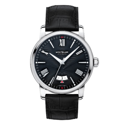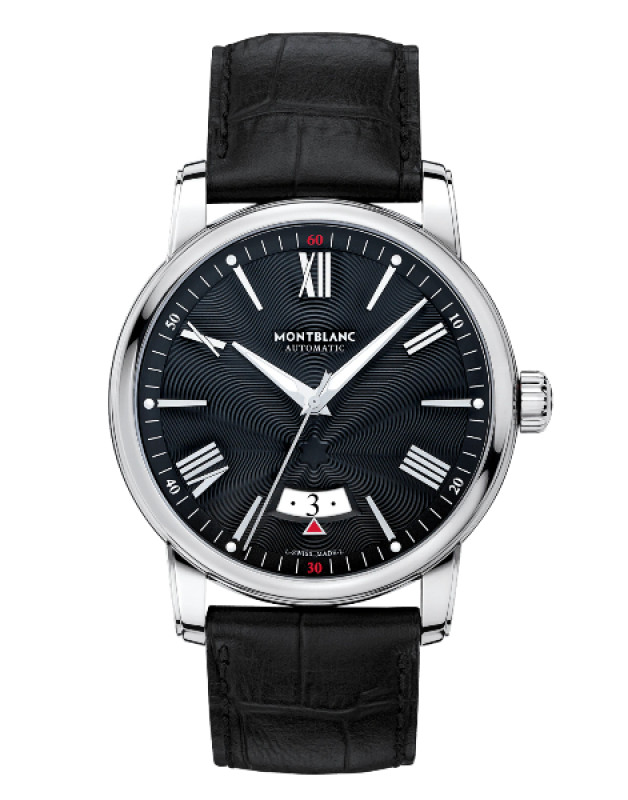 Caratterizzato dalla semplicità classica di un orologio a tre lancette, l’indicazione centrale dell’ora è completata da una semplice finestrella ad arco a ore 6, nella quale un triangolo bianco con profilatura color oro rosso mostra la data corrente. Da sopra il datario, l’emblema Montblanc si irradia a tutto il quadrante grazie a una sapiente incisione guilloché con motivo a stella.