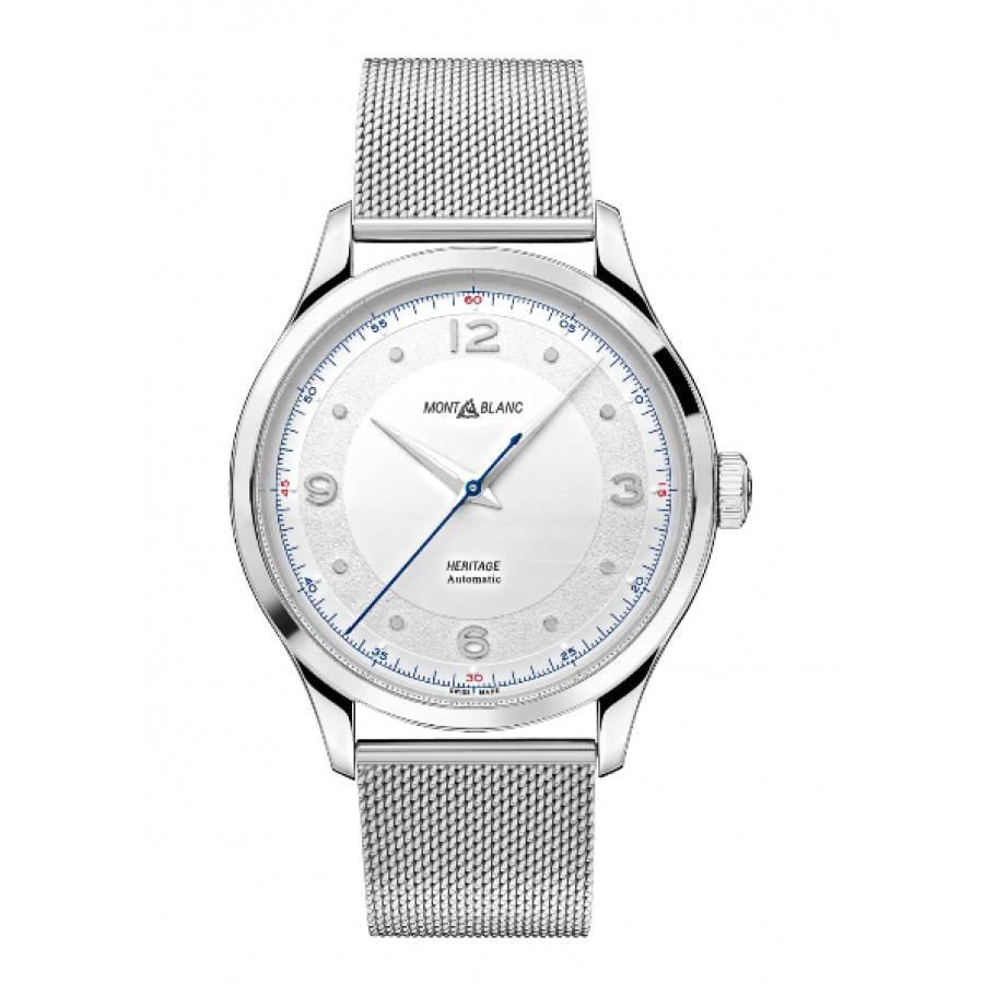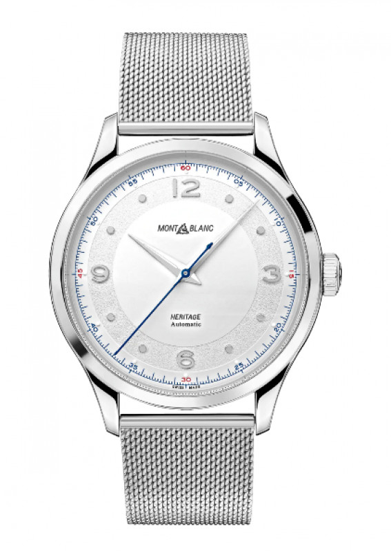 Ispirata agli storici orologi da polso Minerva degli anni '40 e '50, la linea Heritage unisce l'eleganza dell'arte orologiera del passato alla tecnologia e agli audaci codici di design moderni. Il Montblanc Heritage Automatic presenta una cassa in acciaio pregiato di 40 mm con quadrante bianco-argenté ornato di numeri arabi finitura rodio applicati, indici a puntini e lancette enfatizzate da Super-Luminova*. Il Montblanc Heritage Automatic è animato dal movimento automatico MB 24.27 Montblanc ed è corredato da un bracciale di acciaio in maglia milanese.