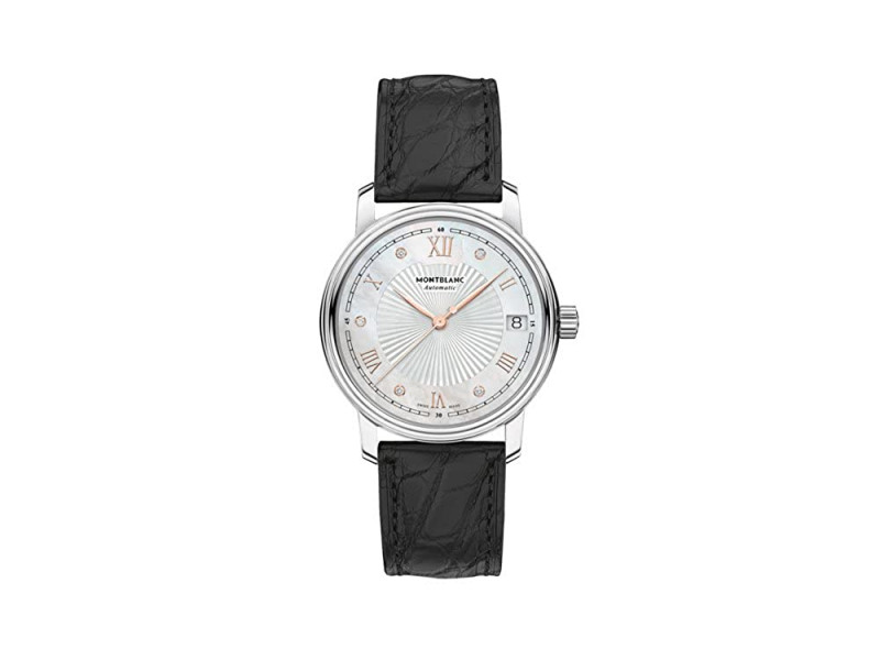 Orologio Montblanc 114957 Lady Tradition Date Automatico è un orologio per signora meccanico a carica automatica con quadrante in madreperla lavorato con diamanti sugli index e un elegante cinturino in pelle di alligatore autentica anallergica.