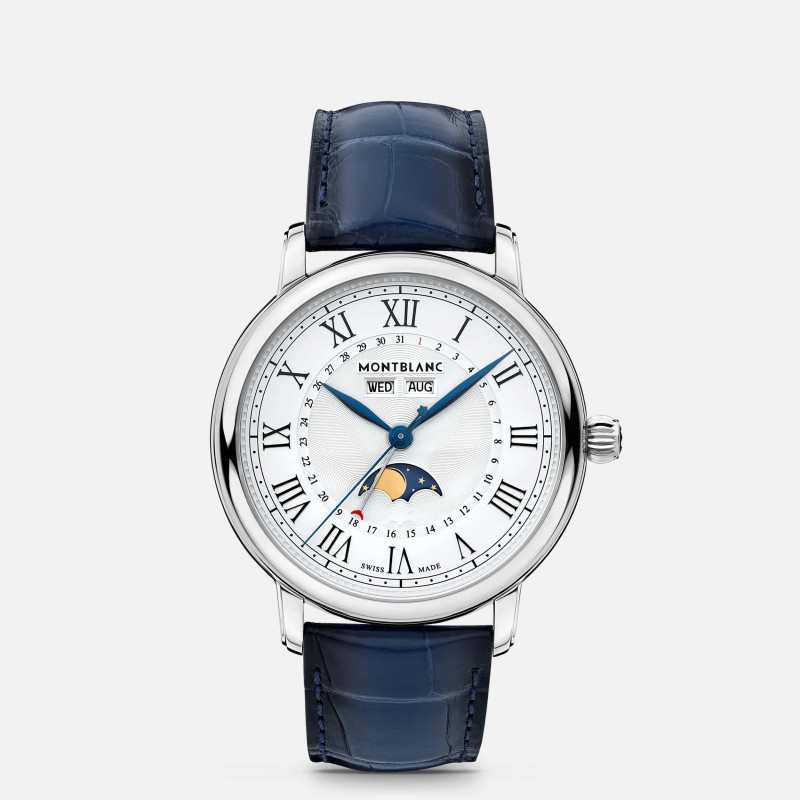 La linea Montblanc Star Legacy trae ispirazione dal patrimonio Minerva e dagli orologi da tasca realizzati dalla Manifattura tra la fine del XIX secolo e l’inizio del XX. Il Montblanc Star Legacy Full Calendar presenta un’elegante cassa in acciaio pregiato da 42 mm con anse dritte ed elementi rialzati sui lati e integra diversi tratti distintivi del design dell’epoca con la cassa tonda, satinata e a forma di ciottolo; corone a cipolla con l’inconfondibile emblema Montblanc e raffinati quadranti con l’iconico motivo guilloché a stella esplosa. Il modello presenta numeri romani e lancette a foglia blu. Tra gli altri dettagli del quadrante figurano una minuteria “chemin de fer” a puntini e un motivo “filet sauté” intorno alla parte esterna del quadrante, una lancetta della data con punta a mezzaluna rossa e un elegante emblema Montblanc sul contrappeso della lancetta dei secondi. Il segnatempo è animato dal calibro automatico MB 24.30 che indica ore, minuti, secondi, giorno, data, mese e fasi lunari. Il giorno della settimana e il mese compaiono in finestrelle sulla parte superiore del quadrante, mentre la parte inferiore è riservata alla visualizzazione delle fasi lunari. Il segnatempo presenta un cinturino in alligatore blu Sfumato.