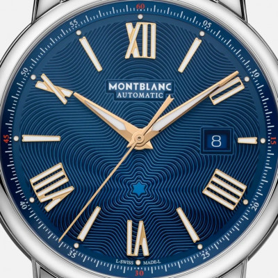 Il Montblanc Star Legacy Automatic Date in edizione limitata di 800 esemplari è impreziosito da un quadrante blu con l’iconico motivo a stella variabile Montblanc e con indici a forma di spada e numeri placcati oro rosa. È alimentato dal movimento automatico MB 24.17 che indica ore, minuti, secondi e data. In termini di design, il segnatempo si ispira agli orologi da tasca Minerva della fine del XIX secolo e inizio del XX con le loro casse rotonde, lucide e a forma di ciottolo e le corone a cipolla. Questo segnatempo è altresì dotato di un cinturino intercambiabile in pelle di vitello blu con stampa alligatore e impunture tono su tono.