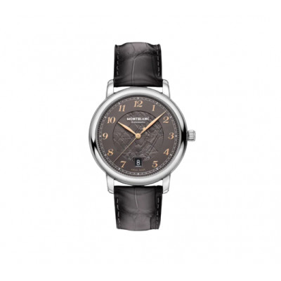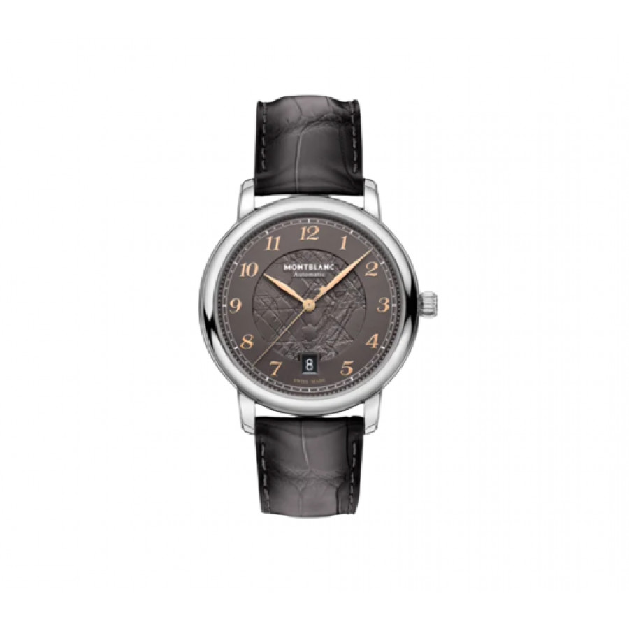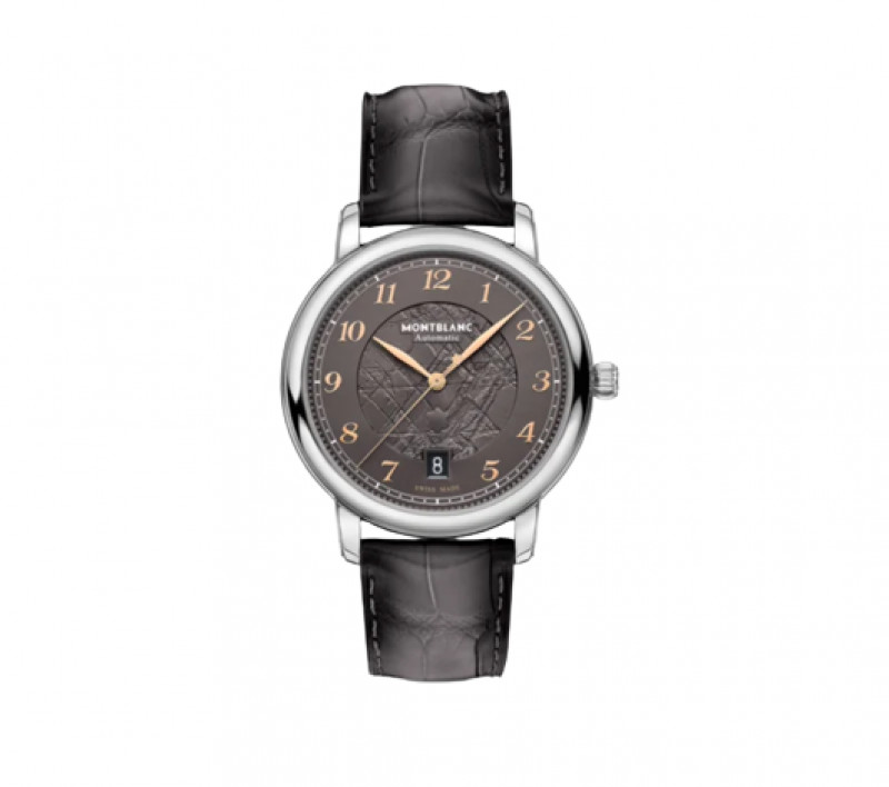 L'orologio Star Legacy Grey Automatic Date in edizione limitata di 1786 esemplari è dotato di una cassa in acciaio pregiato di 39 mm che mette in risalto il versante roccioso esposto a sud. Il quadrante grigio con motivo "ghiacciato" è messo in evidenza dalle lancette e dai numeri arabi in oro rosa. Il doppio emblema Montblanc offre un ulteriore tocco di classe: è presente sulla lancetta dei secondi e sul quadrante in corrispondenza della data che si incrocia ogni minuto. Il segnatempo si presenta con cinturino intercambiabile in pelle di vitello grigia con stampa alligatore.