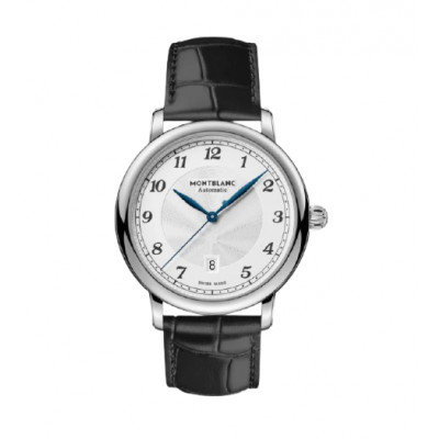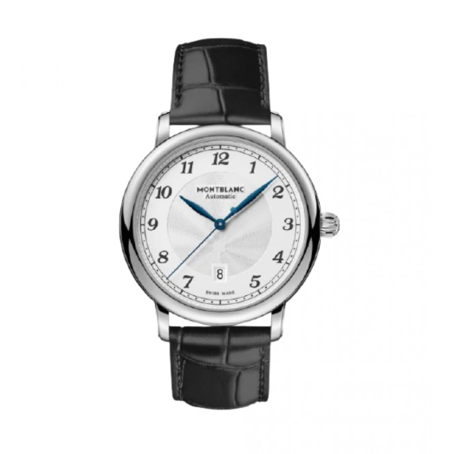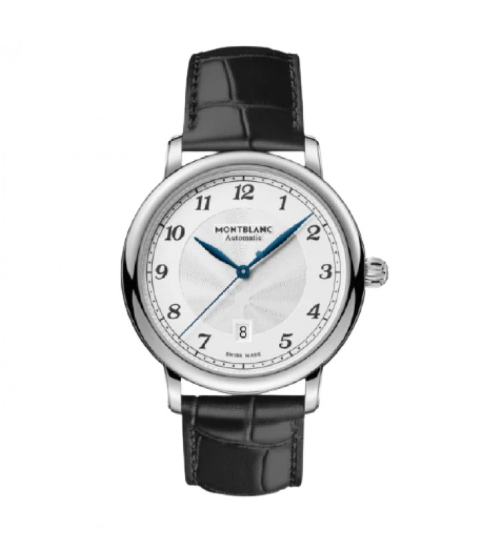 La collezione Montblanc Star Legacy trae ispirazione dal patrimonio Minerva e dai suoi orologi da tasca realizzati fra la fine del XIX secolo e l’inizio del XX. In armonia con i codici di design della linea, il Montblanc Star Legacy Automatic Date presenta un raffinato quadrante bianco-argenté con motivo guilloché a stella variabile Montblanc, numeri arabi, lancette a foglia, un motivo guilloché “filet sauté” e una minuteria “chemin de fer”. Il segnatempo è dotato del calibro automatico MB 24.17 ed è caratterizzato da ore, minuti e secondi centrali e dalla data in una finestrella a ore 6. Presenta una cassa in acciaio pregiato da 42 mm ed è corredato da un cinturino in pelle di vitello nera con stampa alligatore.