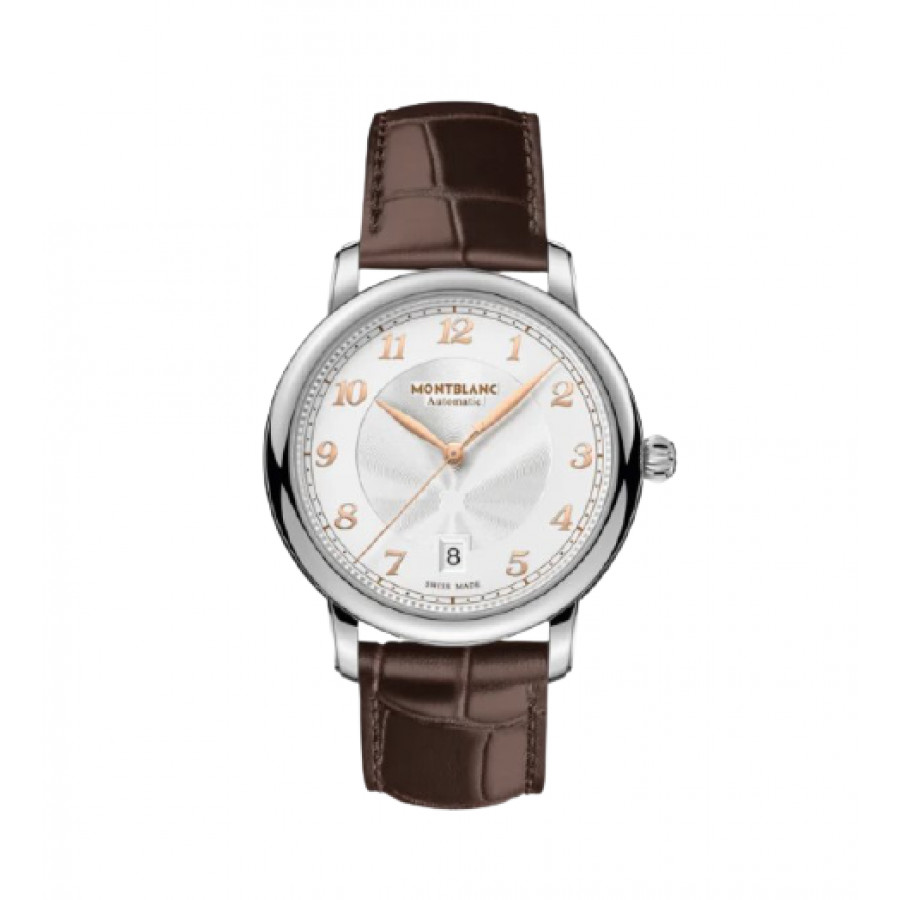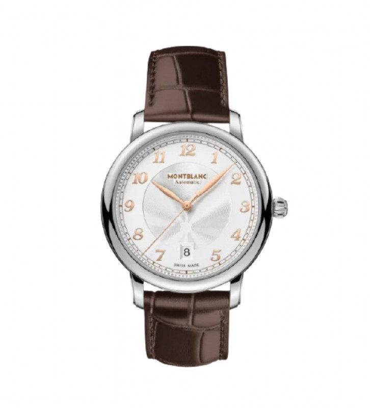 La collezione Montblanc Star Legacy trae ispirazione dal patrimonio Minerva e dai suoi orologi da tasca realizzati fra la fine del XIX secolo e l’inizio del XX. In armonia con i codici di design della linea, il Montblanc Star Legacy Automatic Date presenta un raffinato quadrante bianco-argenté con motivo guilloché a stella variabile Montblanc, numeri arabi, lancette a foglia, un motivo guilloché “filet sauté” e una minuteria “chemin de fer”. Il segnatempo è dotato del calibro automatico MB 24.17 ed è caratterizzato da ore, minuti e secondi centrali e dalla data in una finestrella a ore 6. Presenta una cassa in acciaio pregiato da 39 mm ed è corredato da un cinturino in pelle di vitello marrone con stampa alligatore.