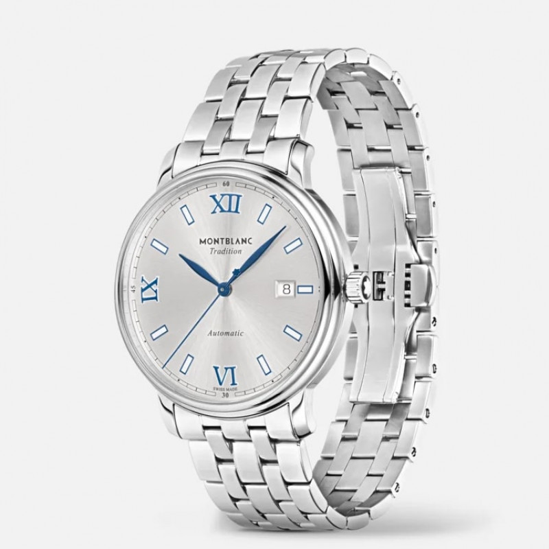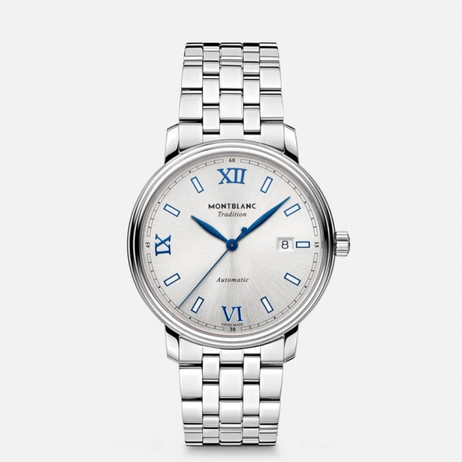 La Montblanc Tradition Collection sfoggia il caratteristico design Montblanc e i codici classici dell’arte orologiera. Il Montblanc Tradition Automatic Date presenta una cassa in acciaio pregiato da 40 mm con anse dritte e una lunetta doppia. Il segnatempo presenta un quadrante bianco argenté con numeri romani blu in rilievo e indici bianchi. La tradizionale minuteria “chemin de fer” e le classiche lancette a foglia e a bastone completano questo elegante look.