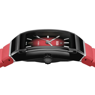 Fin dal suo debutto nel 1983, Rado Anatom è stato simbolo di un design all’avanguardia e di un comfort estremo. La sua caratteristica distintiva è il cristallo zaffiro metallizzato cilindrico, con smussatura simmetrica su entrambi i lati e continua che si fonde nella cassa in ceramica high-tech lucida, proseguendo attraverso le maglie finali in acciaio inossidabile lucido per unirsi infine nel cinturino affusolato in gomma rosso pompelmo. Questo insieme è assicurato da una fibbia a tripla piega in acciaio inossidabile spazzolato con una copertura in ceramica high-tech lucida. Sotto questo caratteristico cristallo si nasconde un quadrante con sfumature che spaziano dal nero al rosso pompelmo. Le lancette e gli indici applicati color rodio sono rivestiti con Super-LumiNova® bianca che crea un raffinato contrasto con la profondità del quadrante. A coronare il quadrante a ore 12 c’è l’iconica ancora mobile, accompagnata da una finestrella discreta per la data, posizionata a ore 6. Nel suo cuore pulsante, esaltato dal fondello in vetro zaffiro, batte un calibro automatico R766 a 21 rubini. Regolato finemente in cinque posizioni e dotato di una spirale Nivachron™, questo movimento offre un alto livello di precisione e una notevole riserva di carica di 72 ore, sottolineando l’impegno di Rado per la perfezione.