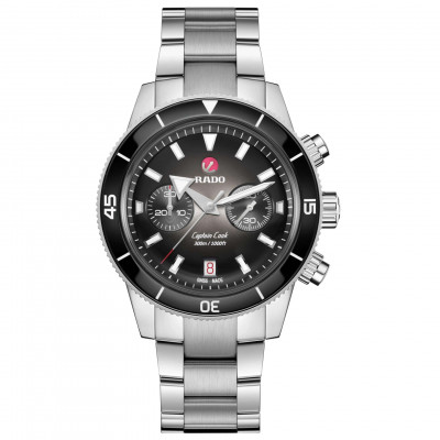 Il Rado Captain Cook Chronograph vanta il caratteristico cristallo zaffiro sagomato antigraffio con trattamento antiriflesso su entrambi i lati. La cassa sottile ed elegante da 43 mm in acciaio dispone di un inserto in ceramica hi-tech nera lucida sulla lunetta, in abbinamento al quadrante sfumato dall’argento al nero. Numeri, indici e triangoli sono rivestiti in Super-LumiNova®. All'interno, il nuovo e più sottile movimento automatico R801, con 37 rubini, cinque lancette e 59 ore di riserva di carica grazie alla spirale antimagnetica Nivachron™ supera i requisiti standard nei test di precisione da 3 a 5 posizioni. L’esemplare è dotato di un bracciale in acciaio lucido e spazzolato, oltre a un cinturino in pelle marrone e a un cinturino aggiuntivo in tessuto nero.