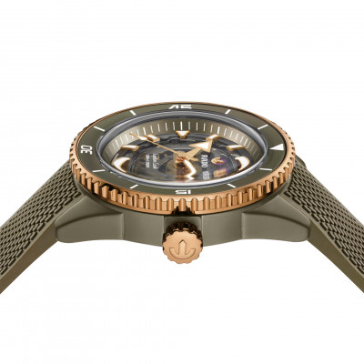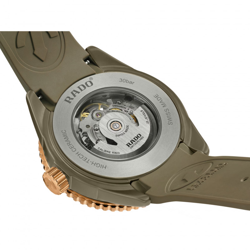 Il Rado Captain Cook High-Tech Ceramic Skeleton vanta l’innovativo movimento R808, meraviglioso connubio di contrasti, know-how e ingegnosa geometria che consente una chiara visione dei vari componenti. È dotato di una spirale antimagnetica NivachronTM altamente affidabile che è stata accuratamente testata in cinque posizioni e fornisce fino a 80 ore di riserva di carica. La cassa monoblocco in ceramica high-tech verde oliva opaco è incorniciata in una lunetta girevole color oro rosa e un inserto di ceramica verde oliva opaco coordinato con la cassa e le anse per dar vita ad un affascinante esemplare. Il quadrante è sobrio e minimale, con indici geometrici grandi e lancette di ore/minuti/secondi in tonalità oro rosa, trattati con Super-LumiNova® di colore bianco per ottenere una leggibilità ottimale anche in condizioni di scarsa illuminazione. Con il suo cinturino in caucciù coordinato color verde oliva e la cover della fibbia in ceramica high-tech, il nuovo Captain Cook mostra il suo lato sportivo.