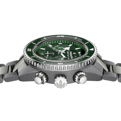 Il cronografo Captain Cook in ceramica high-tech è il risultato di un processo produttivo senza compromessi, che fonde innovazione, tecnica e design in un’unica visione. Nato dall’unione di elementi primordiali e competenza ingegneristica, spinge oltre ogni limite la concezione moderna di costruzione orologiera. La cassa monoblocco da 43 mm è realizzata in ceramica high-tech al plasma, frutto di un processo di trasformazione estremo in cui la ceramica bianca viene esposta a gas attivati a 20.000 gradi Celsius. In questo ambiente torrido, la sua struttura molecolare viene alterata, dando origine a una finitura metallica unica, ottenuta senza l'impiego di una singola particella di metallo. Un'opera d'ingegneria dei materiali, con lunetta girevole in acciaio inox e inserto in ceramica verde lucida, dotata di indici in Super-LumiNova® bianca. Il cristallo zaffiro sagomato, forgiato a temperature superiori a 2.000 °C e trattato con rivestimenti antiriflesso su entrambi i lati, garantisce una nitidezza impeccabile e una durezza seconda solo al diamante. Al suo interno il calibro R801, un movimento cronografico a carica automatica sviluppato per un'affidabilità senza compromessi. Realizzato con 37 rubini e regolato in cinque posizioni, assicura una misurazione di precisione del tempo anche nelle condizioni più difficili. Il movimento è dotato di spirale antimagnetica Nivachron™. Il movimento R801, cuore pulsante dell'orologio, con una riserva di carica di 59 ore, è progettato per resistere alle sfide quotidiane, garantendo affidabilità e precisione nel tempo. Il quadrante nero incarna l'equilibrio perfetto tra funzionalità e design. Gli indici e le lancette color rodio sono rivestiti con Super-LumiNova® bianca, mentre tre contatori disposti con precisione indicano le funzioni di 12 ore, 30 minuti e piccoli secondi. Un datario a ore 6 e l'iconica ancora girevole su una piastra posteriore in rubino completano la firma meccanica del quadrante. La combinazione di ceramica high-tech nera opaca e lucida nel bracciale, insieme alla fibbia in titanio a tripla piega, completa il design con una vestibilità perfetta. Progettato per resistere fino a 30 bar (300 m), il Rado Captain Cook High-Tech Ceramic è il compagno ideale per chi cerca l'avventura con stile e precisione svizzera.