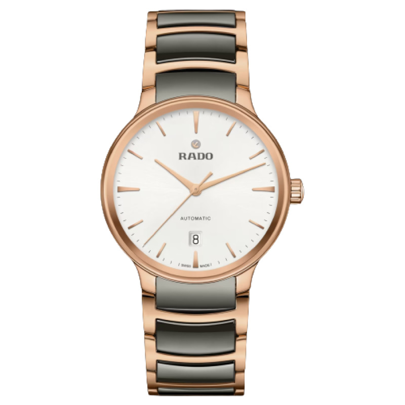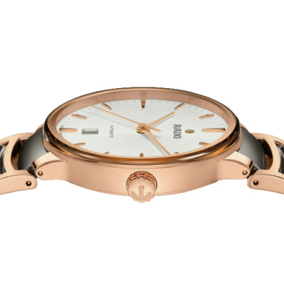 Il classico Rado Centrix Automatic è stato rielaborato non solo tecnicamente, ma anche esteticamente. Il nuovo modello dispone di un cristallo zaffiro arrotondato che si estende fino al bordo e di una cassa ricurva che si integra con l’estremità del cristallo. Le anse della cassa ridisegnate e il bracciale in acciaio lucido rivestito in PVD color oro rosa con maglie centrali in ceramica hi-tech al plasma completano l’estetica rinnovata di questo iconico segnatempo. Il quadrante soleil argentato, con indici applicati color oro rosa, si abbina perfettamente alle lancette color oro rosa. All’interno, il calibro R763 a tre lancette supera gli standard di precisione nei test da 3 a 5 posizioni e grazie alla spirale antimagnetica Nivachron™ garantisce elevata affidabilità e puntualità. L’orologio è impermeabile fino a 50 m e vanta una riserva di carica di 80 ore.