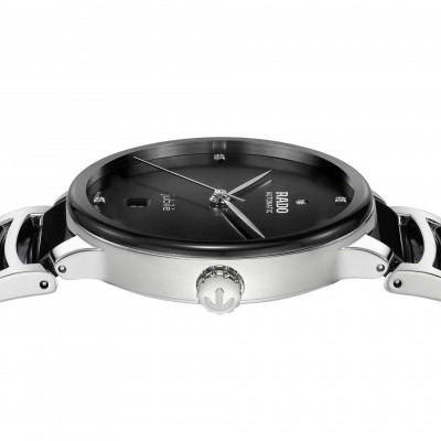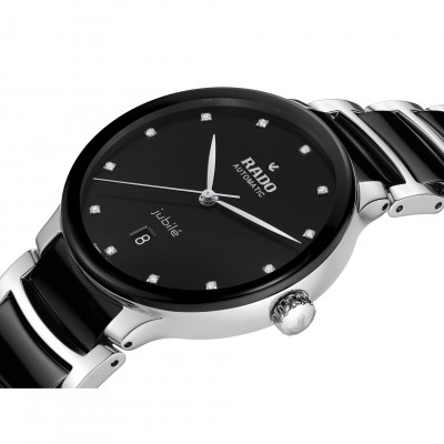 Il classico Rado Centrix Automatic Diamonds è stato rielaborato non solo tecnicamente, ma anche esteticamente. Il nuovo modello dispone di un cristallo zaffiro arrotondato che si estende fino al bordo e di una cassa ricurva che si integra con l’estremità del cristallo. Le anse della cassa ridisegnate e il bracciale in acciaio lucido con maglie centrali in ceramica hi-tech nera completano l’estetica rinnovata di questo iconico segnatempo. Il quadrante nero soleil, impreziosito da 12 brillanti, sottolineato dal logo “jubilé” stampato, si abbina perfettamente alle lancette color rodio. All’interno, il calibro R763 a tre lancette supera gli standard di precisione nei test da 3 a 5 posizioni e grazie alla spirale antimagnetica Nivachron™ garantisce elevata affidabilità e puntualità. L’orologio è impermeabile fino a 50 m e vanta una riserva di carica di 80 ore.