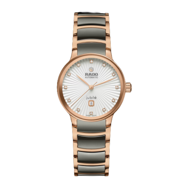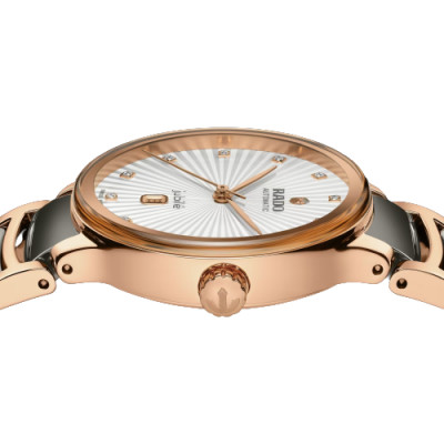 Il classico Centrix Automatic Diamonds è stato rielaborato non solo tecnicamente, ma anche esteticamente. Il nuovo modello dispone di un cristallo zaffiro arrotondato che si estende fino al bordo e di una cassa ricurva che si integra con l’estremità del cristallo. Le anse della cassa ridisegnate e il bracciale in acciaio lucido rivestito in PVD color oro rosa con maglie centrali in ceramica hi-tech al plasma completano l’estetica rinnovata di questo iconico segnatempo. Il quadrante marrone sfaccettato dispone di uno spettacolare effetto 3D realizzato tramite la stampa di un quadrante sagomato che viene poi riempito di lacca. All’interno, il calibro R582 a tre lancette supera gli standard di precisione nei test da 3 a 5 posizioni e grazie alla spirale antimagnetica Nivachron™ garantisce elevata affidabilità e puntualità. L’orologio è impermeabile fino a 50 m e offre una riserva di carica di 48 ore.
